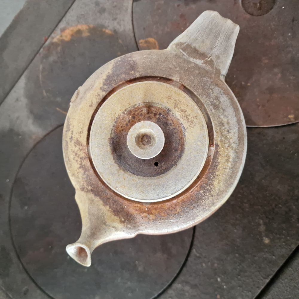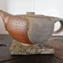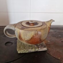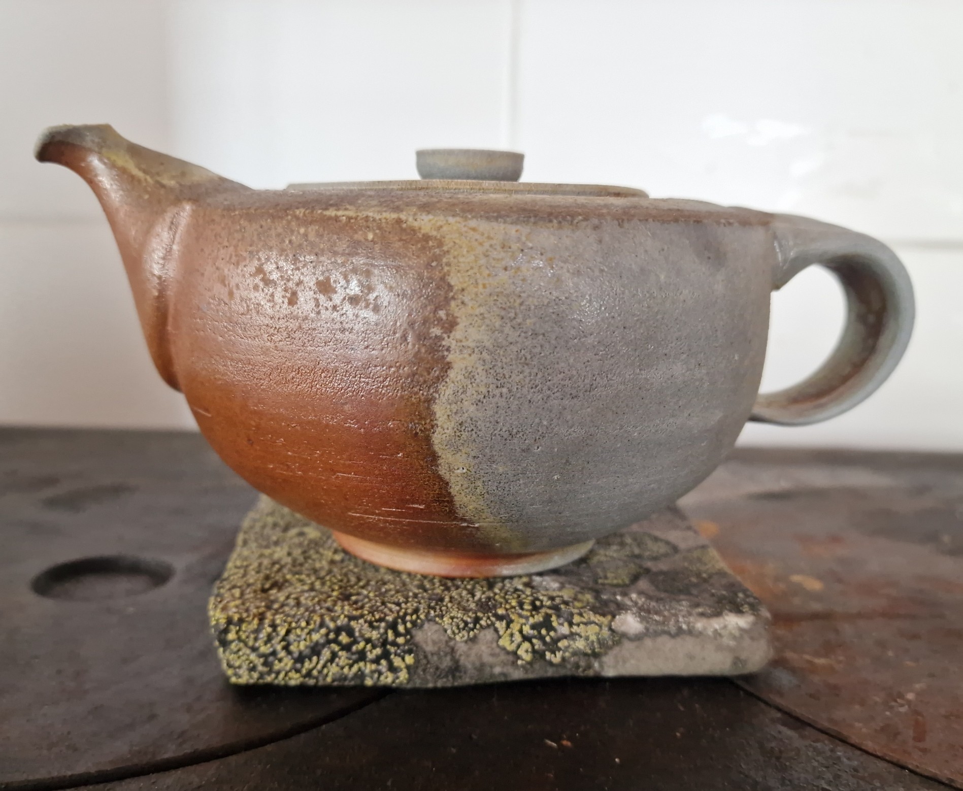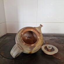 Teekannu, käsindreijattu, puupoltettu kolme vuorokautta anagamauunissa, Kohilassa, Eestissä kesällä 2025. Mennyt uuniin lasittamattomana, vain luonnollinen tuhkalasitus, hienot liekin jäljet. Uniikki tuote.  Myös sisäpuoli on lasittamaton, jolloin käytössä kannuun tulee teestä patina ja tietty makuprofiili. Vetoisuus 6 dl.